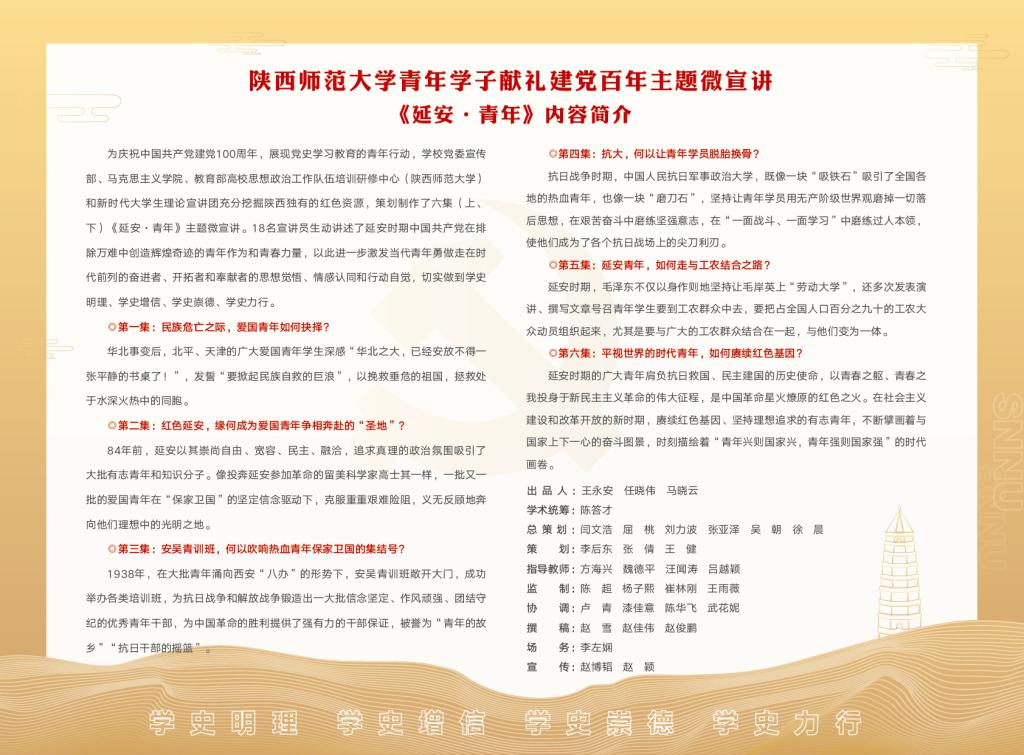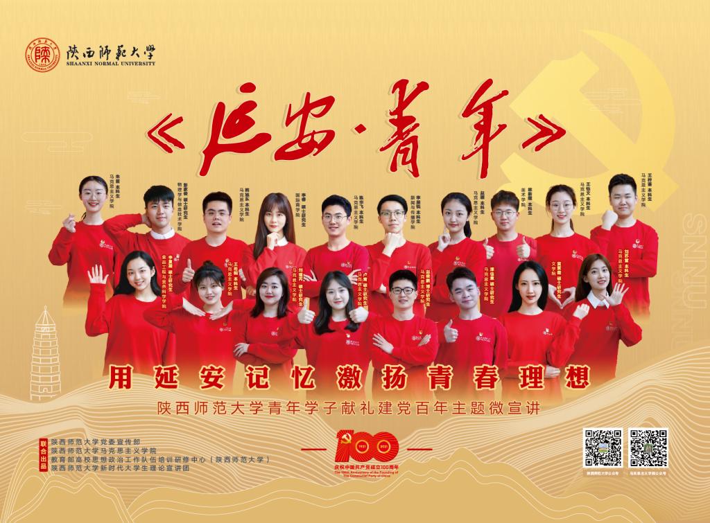 为庆祝中国共产党成立100周年,由学校党委宣传部、马克思主义学院、教育部高校思想政治工作队伍培训研修中心(陕西师范大学)和新时代大学生理论宣讲团联合制作的《延安·青年》主题微宣讲发布仪式将于2021年4月29日(周四)19:20在我校长安校区新勇学生活动中心学生剧场举行。