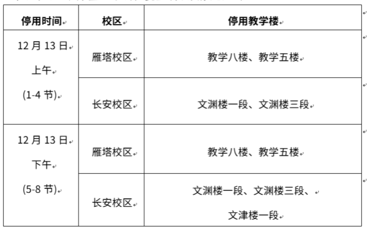 为营造良好的考试环境,届时将对相关教学楼进行封闭式管理,所涉及教室全部停课。请各学院(部)及相关任课教师根据课程教学需要安排补课,其他需要该部分教室进行的活动全部停止。具体教室停用情况如下: