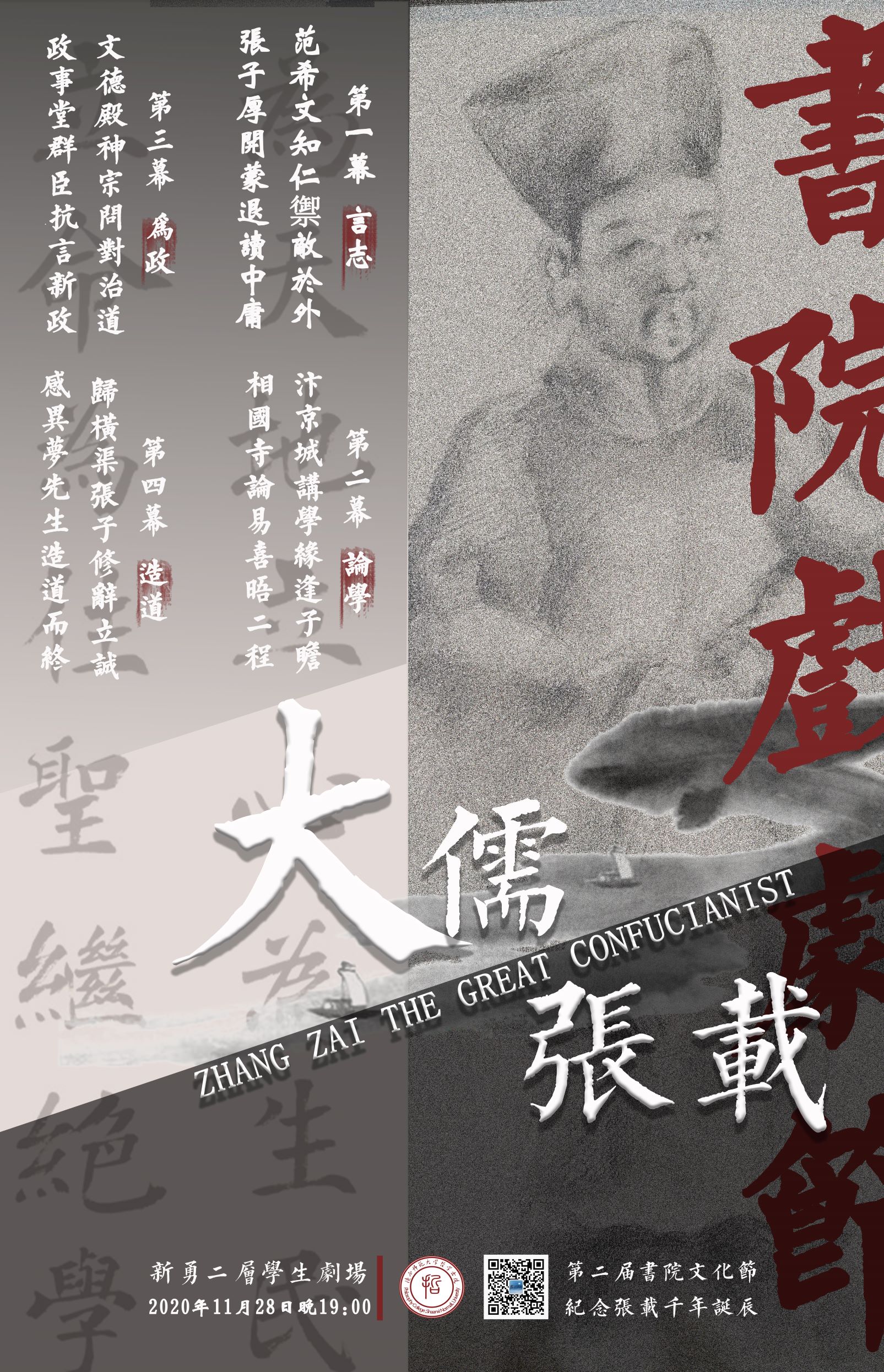 为纪念张载诞辰千年,陕西师范大学哲学书院自编自导自演的大型原创历史话剧《大儒张载》将于11月28日(本周六)晚19:00在长安校区新勇二层学生剧场正式公演。