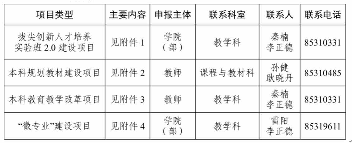 3.截止时间:各类项目申报材料须于2026年3月13日(星期五)前提交至指定联系人;其中“本科教育教学改革项目”需在开放时间内通过系统完成线上填报与审核工作。