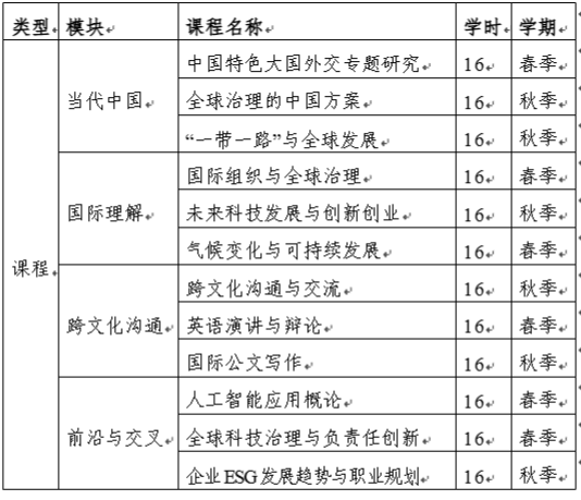 项目采用“课程+实践”的培养模式,包含12门核心课程、1门实务课程、9场以上结合课程主题的线上线下系列讲座,以及与课程教学有机衔接的9项以上的国内外实践活动。
