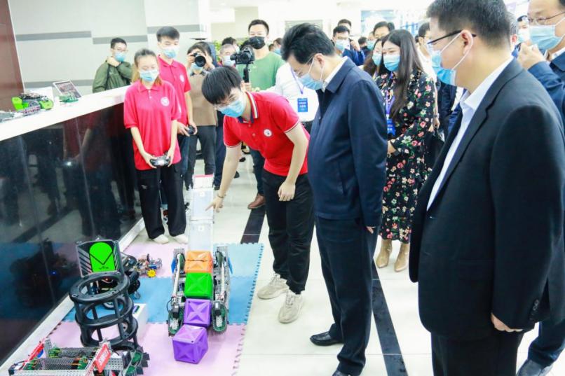 我校教育学部中小学机器人实验室,园丁创客空间公益筑梦团队“梦科教育”在带队教师秦健和杨冬的指导下参加活动。活动期间,教育学部“梦科教育”团队展示了与科普公益相关的机器人创客作品。胡衡华驻足我校展位,与同学们亲切交谈并给予指导。教育学部2019级教育技术学专业科技志愿者莫启明向胡衡华介绍,团队致力公益十一年,坚持科普公益进校园,自主设计发挥精准投篮和货物搬运的VEX机器人,参加多次国际、国内赛事,与国内外知名大学同台竞技并取得优异成绩。