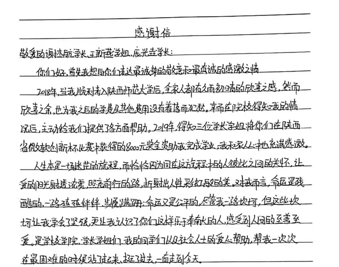 考虑到邓龙彦家庭经济情况,同学们也积极为他送去温暖。计算机科学学院硕士生谢杰航、王新燕和博士生庞光垚听说了邓龙彦的事情,主动将获得的微软“创新杯”陕西高校大学生创新创业大赛一等奖奖金8000元全部捐献给他,这更让邓龙彦体会到莫大的鼓舞与感动,他立志要力所能及地帮助他人。
