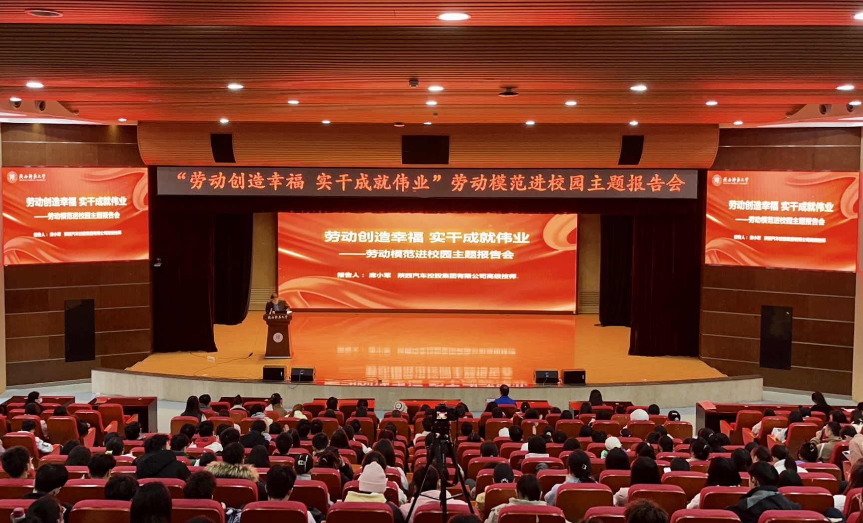 师大新闻网讯 11月15日下午,我校举办“劳动创造幸福·实干成就伟业”劳动模范进校园专题报告会。会议邀请陕西汽车控股集团高级技师、首届“三秦工匠”、陕西省劳动模范、国家级科学技术进步奖一等奖获得者席小军作专题报告。全校各院部师生代表400余人参加报告会。