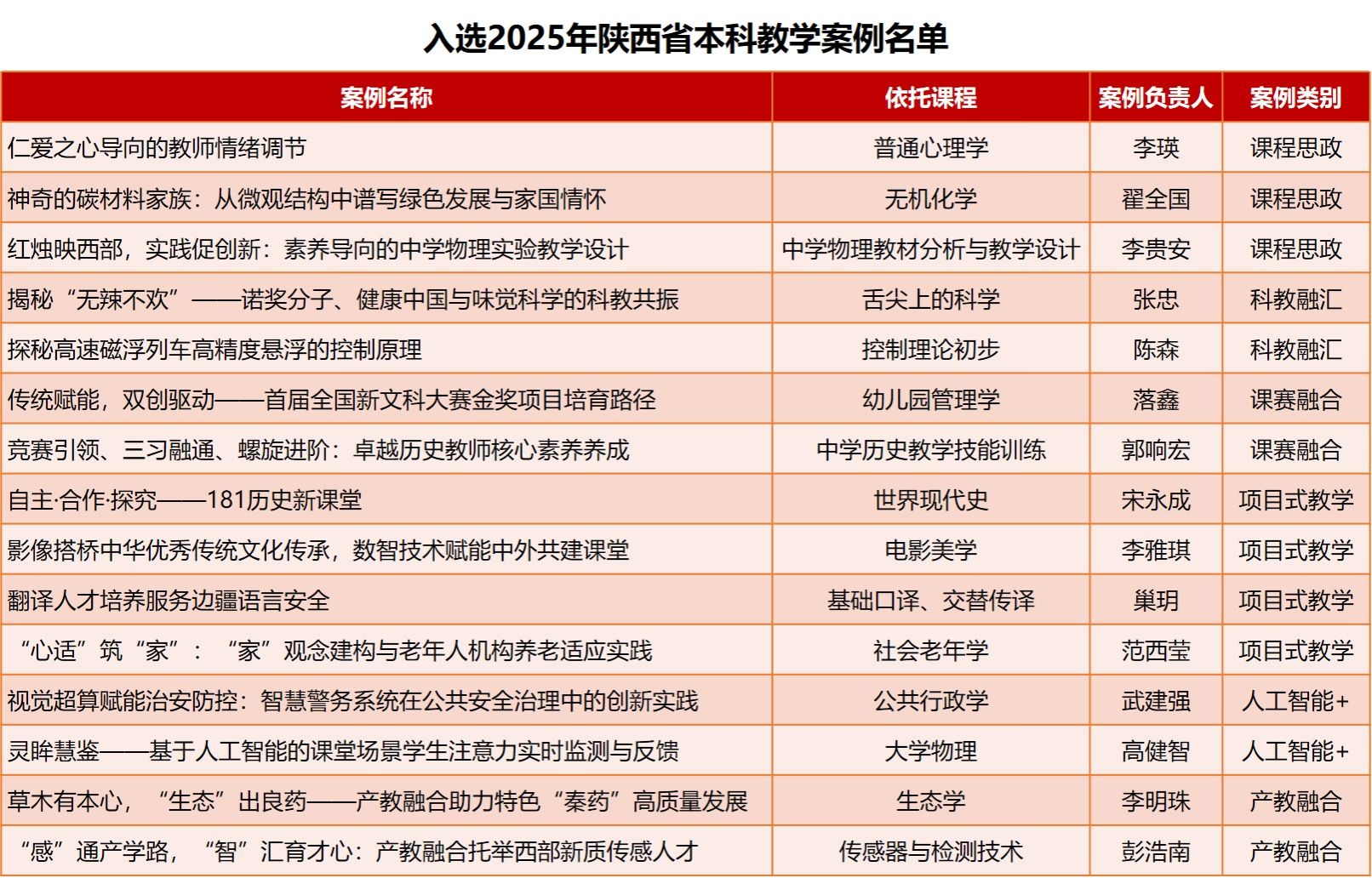 师大新闻网讯近日,陕西省教育厅公布2025年本科教学案例遴选结果,我校《仁爱之心导向的教师情绪调节》等15个教学案例成功入选。