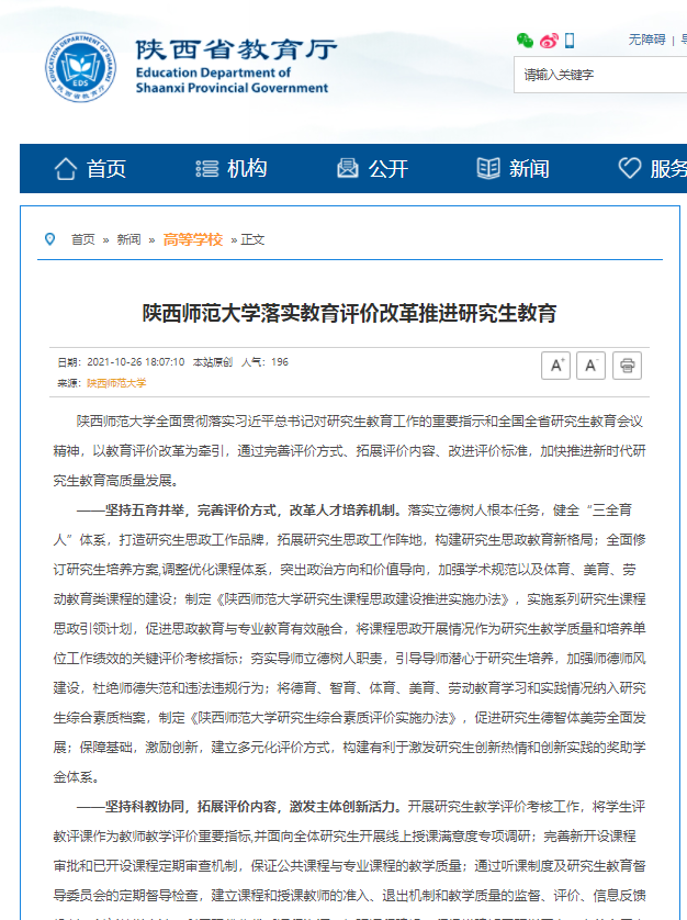 师大新闻网讯 10月26日,陕西省教育厅网站以“陕西师范大学落实教育评价改革推进研究生教育”为题,从改革人才培养机制、拓展评价内容、改进评价标准等三个方面对我校落实教育评价改革任务,推进研究生教育高质量发展进行了报道与推介。