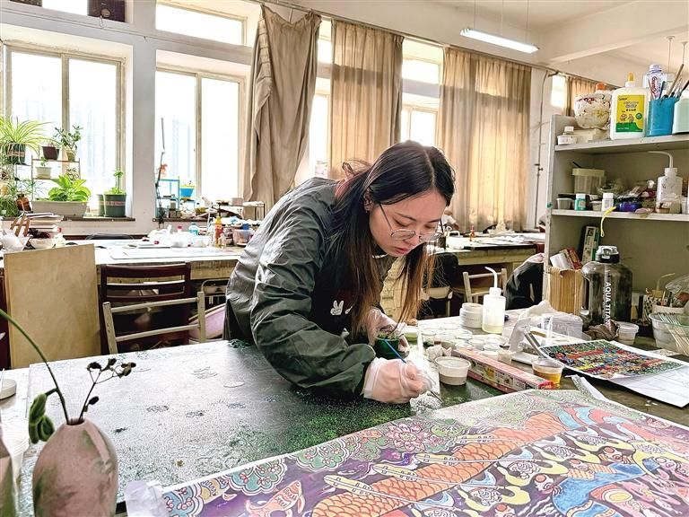 陕西师范大学美术学院的学生在创作漆画作品。本报记者付玉玮摄