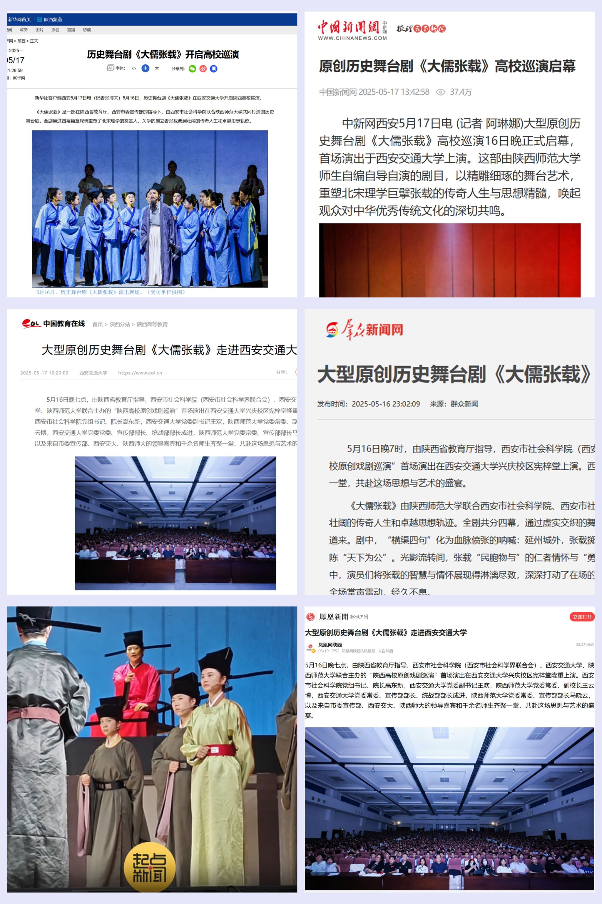 师大新闻网讯 5月16日至24日,在陕西省委教育工委、省教育厅的指导下,西安市委宣传部的支持下,由我校联合西安市社会科学院联合出品的历史舞台剧《大儒张载》参加“陕西高校原创戏剧巡演”活动,先后在西安交通大学等4所高校巡演。陕西省委教育工委、省教育厅、西安市委、西安社科院及各高校领导嘉宾以及4000余名师生到场观演。新华网、中新网、中国教育在线、群众新闻网等20余家主流媒体对活动进行报道。