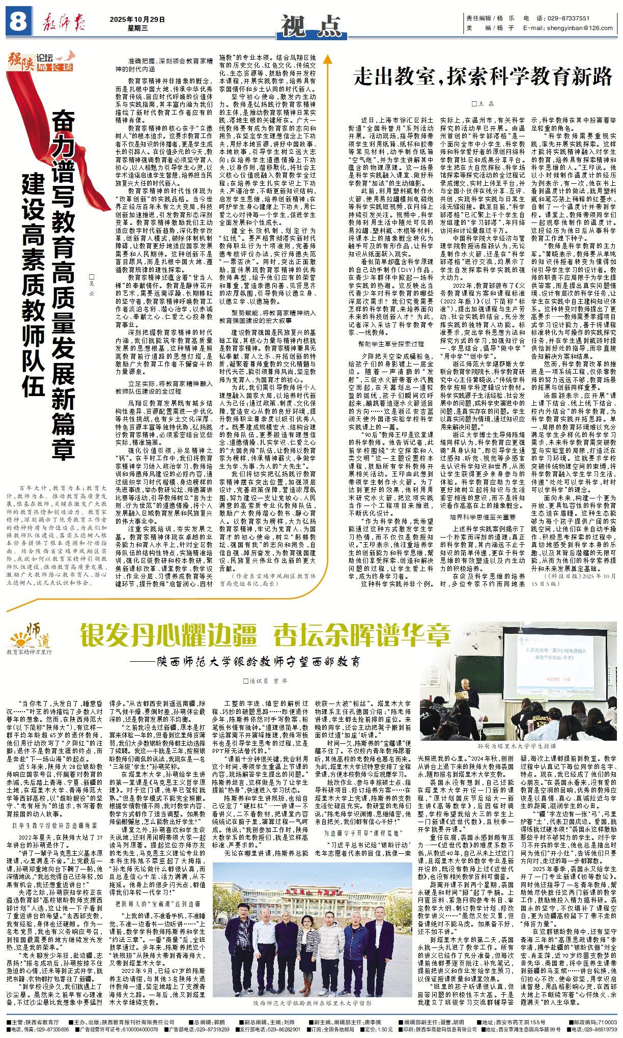师大新闻网讯10月29日,《教师报》第8版“师道·教育家精神万里行”栏目,以“银发丹心耀边疆 杏坛余晖谱华章——陕师大银龄教师守望西部教育”为题,报道陕西师范大学银龄教师响应国家号召,怀着对教育的赤诚,在塔里木大学、青海师范大学等西部高校支研支教,助力西部教育高质量发展,书写着教育报国的使命担当。