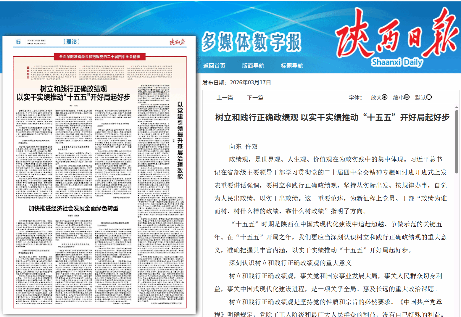 “十五五”时期是陕西在中国式现代化建设中追赶超越、争做示范的关键五年。在“十五五”开局之年,我们更应当深刻认识树立和践行正确政绩观的重大意义,准确把握其丰富内涵,以实干实绩推动“十五五”开好局起好步。