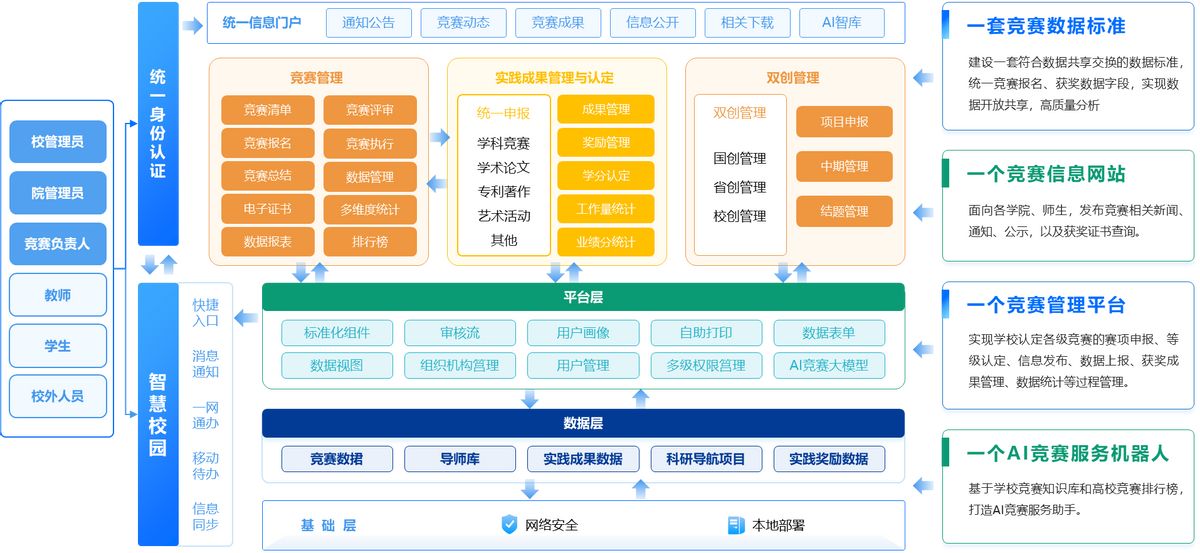 以赛赋能,打造学科竞赛智能管理新引擎。学科竞赛管理平台深度整合国赛、省赛、校赛三级赛事资源与数据,依托人工智能技术构建智能匹配算法,精准捕捉学生专业特长、技能优势与竞赛项目要求的契合点,定向推送备赛资料、导师资源,大幅降低备赛成本、提升备赛针对性与效率。平台通过挖掘分析历年竞赛数据,为学校赛事组织策划、备赛体系优化、培训方案制定提供科学数据支撑。同时实现竞赛报名、资格审核、选手选拔、集中培训、线上评审、成果管理全流程一站式智能化运转,有效简化赛事管理流程、提升组织效能,助力学生竞赛参与度与获奖质量稳步提升。