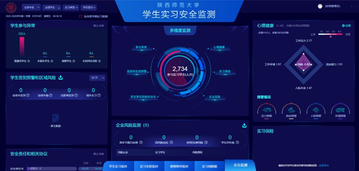 精准赋能,筑牢实习实践质量管控新屏障。聚焦实习实践关键环节,深度融合人工智能与大数据技术,构建AI驱动的学生实习管理平台,对每年约3200余名教育实习学生实现全流程动态追踪。平台实时采集实习周志、考勤打卡、导师评价等多维度过程数据,通过智能算法精准分析学生实习表现,自动预警离岗失联、报告敷衍等异常情况,为及时开展针对性干预提供有力支撑。同时,系统生成个人、院系、专业等多层级实习评估报告,直观呈现实习成效短板,为优化教育实习安排、完善实习基地布局、提升师范生实践能力与培养质量,提供扎实的数据支撑与科学决策依据。