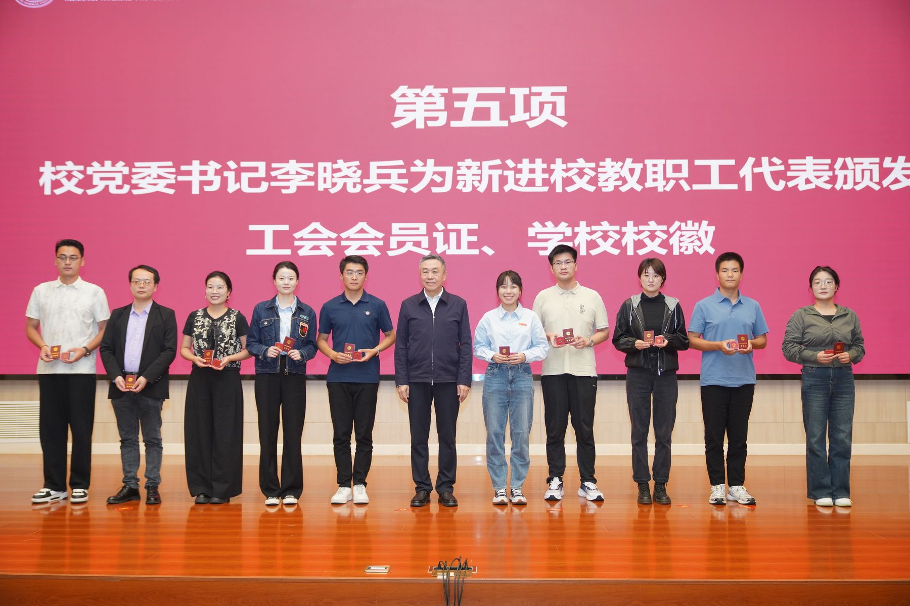 会上,李晓兵为新进校教职工代表颁发工会会员证、校徽并讲话。他强调,学校始终牢记习近平总书记关于教师工作的殷切嘱托和党中央的要求,把师资队伍建设作为战略性、关键性的问题,把弘扬和培育教育家精神融入教师队伍建设全过程,努力让广大教师安心从教、热心从教、舒心从教。他结合个人工作教学经历,阐释了“面向世界、胸怀国家、心系人民、扎根西部、服务陕西”发展理念内涵,希望全体新进校教职工坚定弘扬和践行“教育家精神”,把立德树人的成效作为检验一切工作的根本标准,努力成长为新时代的“大先生”,为强国建设、民族复兴伟业不断作出新的贡献。