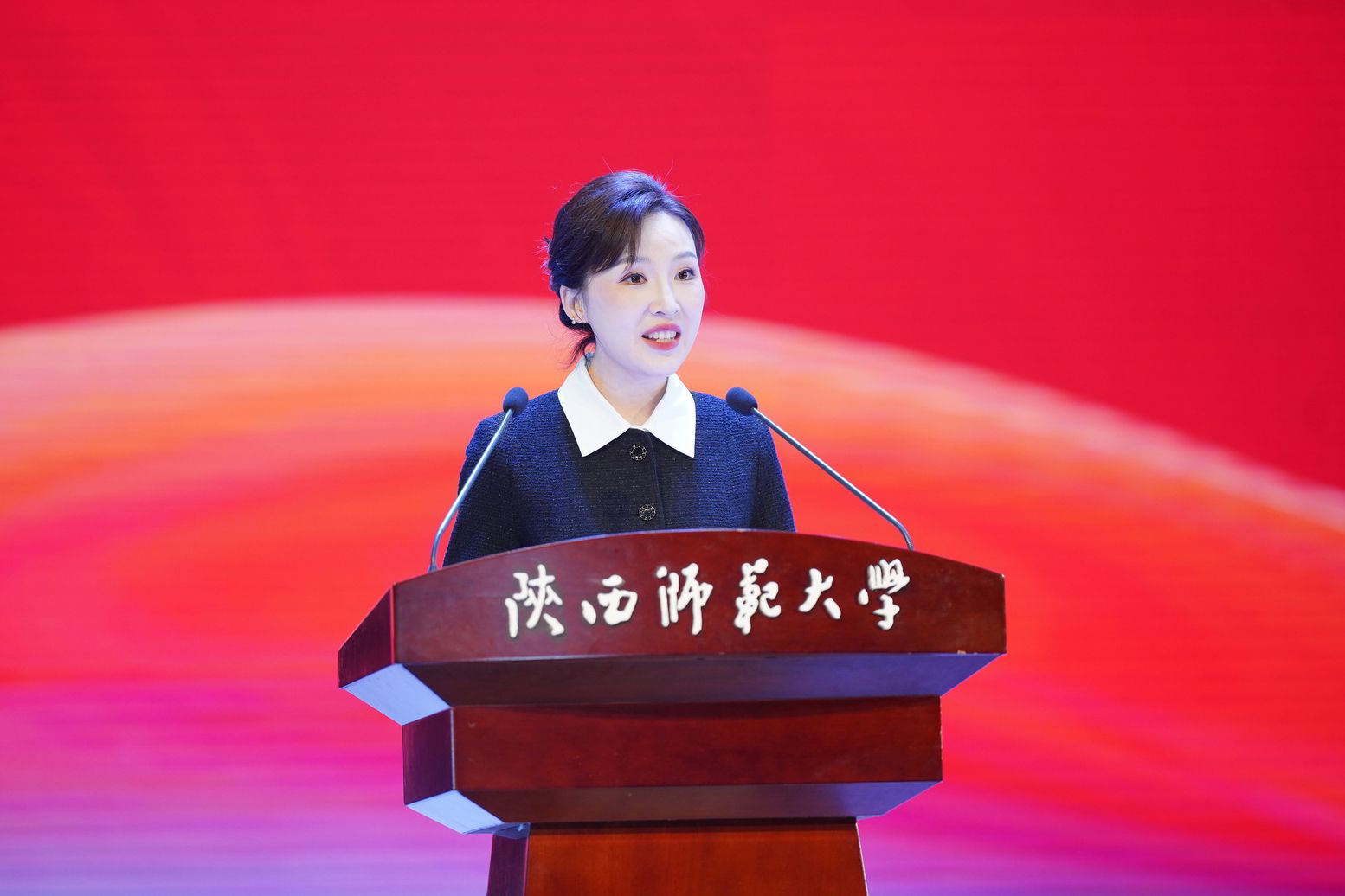 陕西师范大学青年教师贾茹代表全体参展教师表示将以饱满的热情投入展示,积极引导学生将社会主义核心价值观融入专业技能表达,同时自身也将砥砺高尚师德,努力成为学生“为学、为事、为人”的楷模,为新时代学校美育事业贡献智慧与力量。