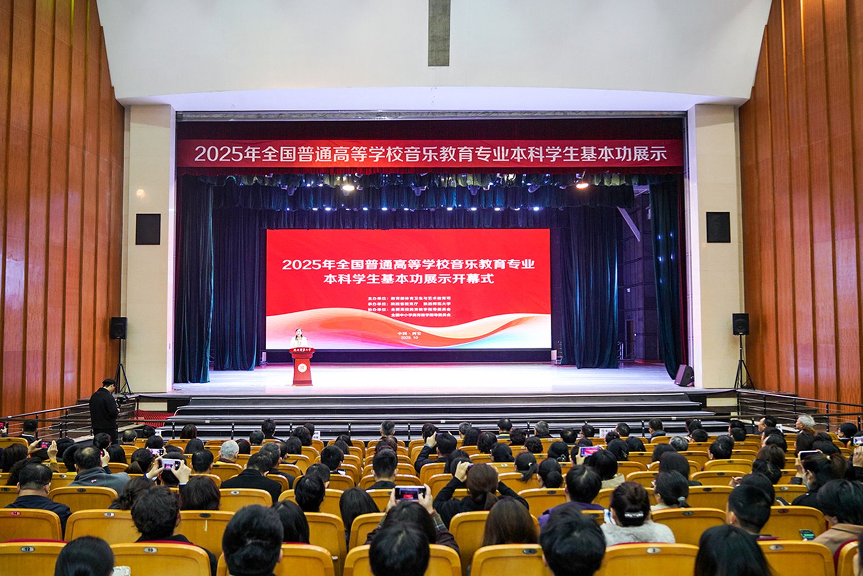 师大新闻网讯10月27日上午,2025年全国普通高等学校音乐教育专业本科学生基本功展示在我校拉开帷幕。此次基本功展示由教育部体育卫生与艺术教育司主办,陕西省教育厅、我校承办。教育部体育卫生与艺术教育司一级巡视员郝风林、陕西省委教育工委委员冀映秋、我校党委副书记卢胜利出席开幕式。会议由教育部体育卫生与艺术教育司艺术与国防教育处副处长刘立京主持。