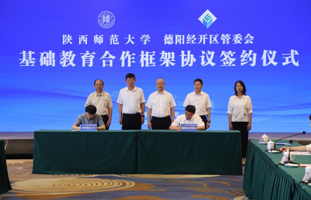 座谈会结束后,陕西师范大学、德阳经开区管委会基础教育合作框架协议签约仪式举行。校长游旭群,德阳经开区党工委副书记、管委会主任廖立新,德阳市委教育工委书记,市教育局党组书记、局长周建平出席签约仪式。